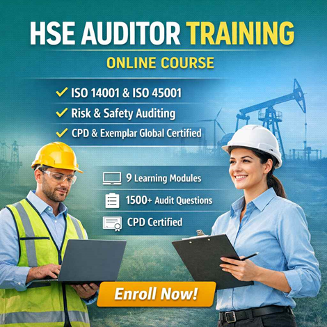 Hse Auditor Training Course - Join NowEnhance your auditing career with HSE Auditor Training Online course, a complete E-learning program covering ISO 14001 and ISO 45001 requirements. This course equips you with hands-on auditing techniques, risk evaluation tools, and documented information management skills. What You Get: 9 structured training modules 210+ pages of downloadable learning material 1500+ ready-to-use audit checklist questions Globally verified Certificate Start auditing professionally today. Enrol in HSE Auditor Training Online course now.
