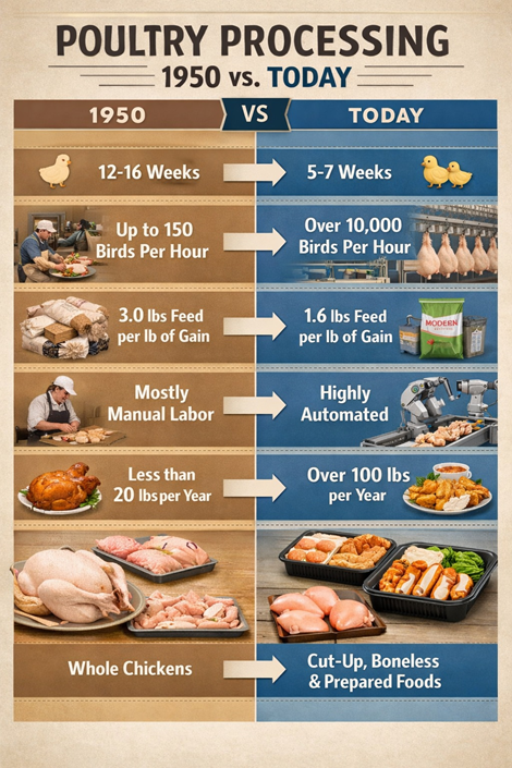 From Hand-Plucked To High-Speed Automatoin.In the 1950s, processing a chicken meant hours of manual labor. Today? Over 10,000 birds per hour move through fully automated lines. The journey from farm to factory floor is one of the most dramatic evolutions in modern food production. Explore how poultry became the most efficient protein in America.