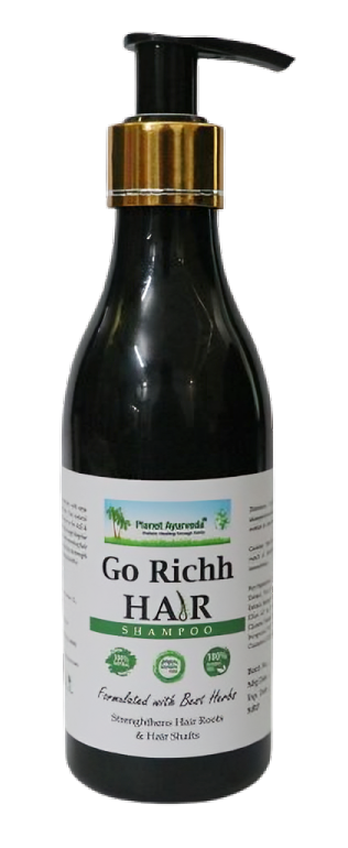 Go Richh Hair Shampoo – Herbal Cleanser For Strong & Shinny HairPlanet Ayurveda GO RICHH Hair Shampoo is a natural herbal formula that gently cleanses the scalp, reduces hair fall, controls dandruff, and promotes strong, shiny, and healthy hair without harmful chemicals.