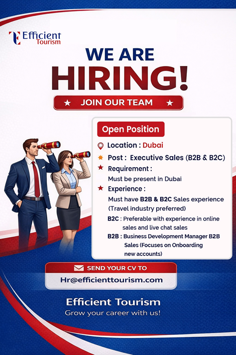 Efficient Tourism Is Hiring Sales Executive In DubaiWe are looking for Executive Sales professionals in Dubai for Efficient Tourism. Applicants must have experience in both B2B and B2C sales. Experience in travel sales and business development is preferred. Candidates should be confident in online and live chat sales. Must be present in Dubai. Email your CV to hr@efficienttourism.com.
