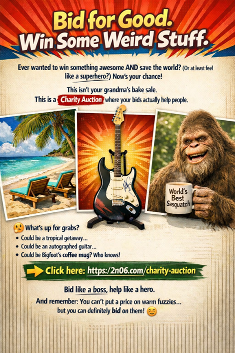 What If The Next Thing You Won Actually Mattered?This isn’t a garage sale. This isn’t random online clutter. This is a Charity Auction where every bid carries weight. You get something meaningful. Someone else gets real support. Unique auction items Easy participation Transparent purpose Feel-good impact (without the guilt trip) We’ve made it simple. No complicated signups. No pressure tactics. Just a straightforward opportunity to bid on items you’d actually want — while contributing to something bigger than yourself. If you enjoy a little friendly competition and love knowing your dollars are doing more than just buying “stuff,” you’ll want to take a look. Visit: https://2n06.com/charity-auction Even if you’re just curious — click through and see what’s available. You might find something you didn’t know you needed. And someone else might find the help they’ve been praying for. Win well. Give well. See what’s up for auction today.